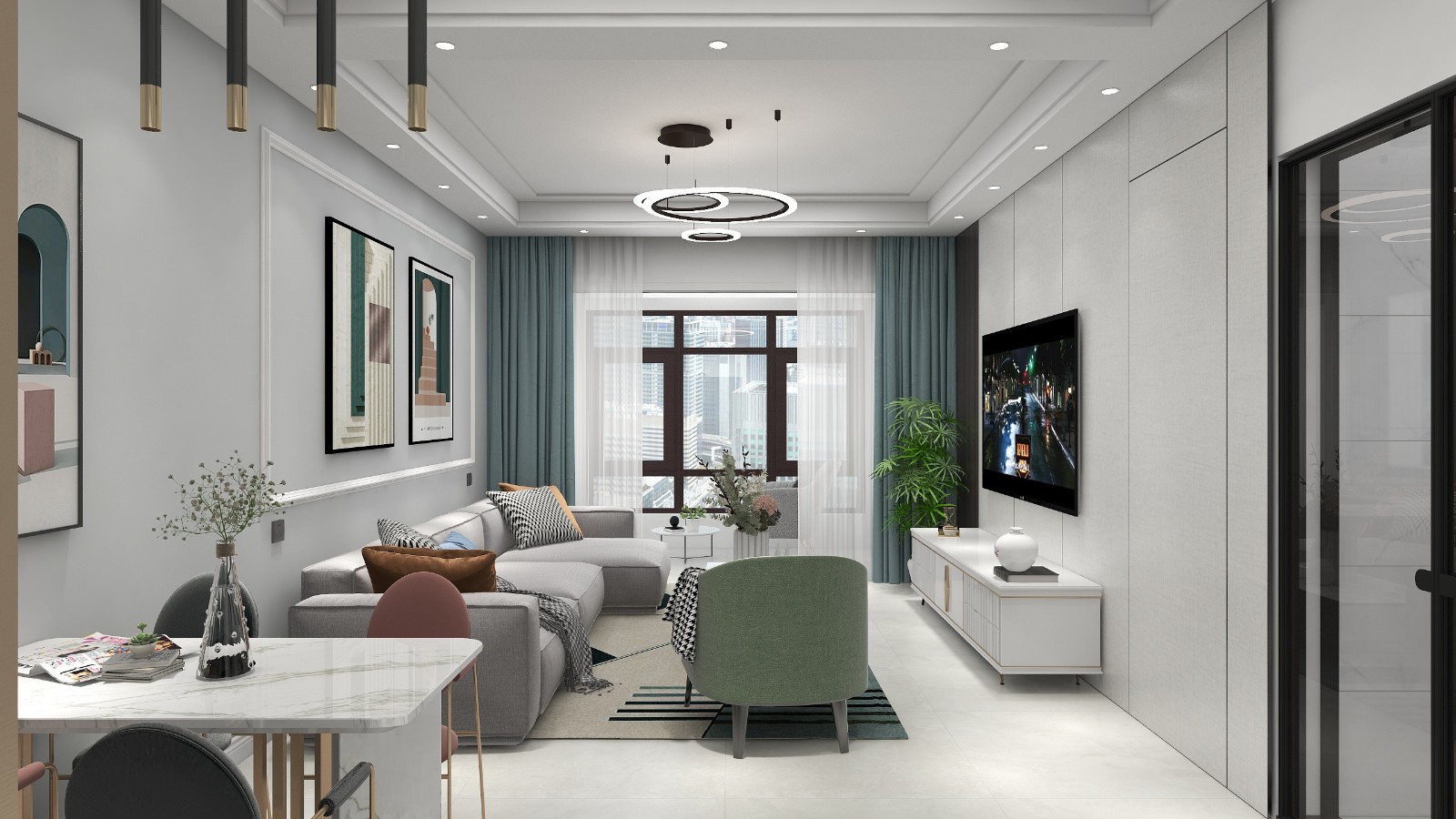 现代浅色客厅,绿色作为跳跃色点缀整个空间。