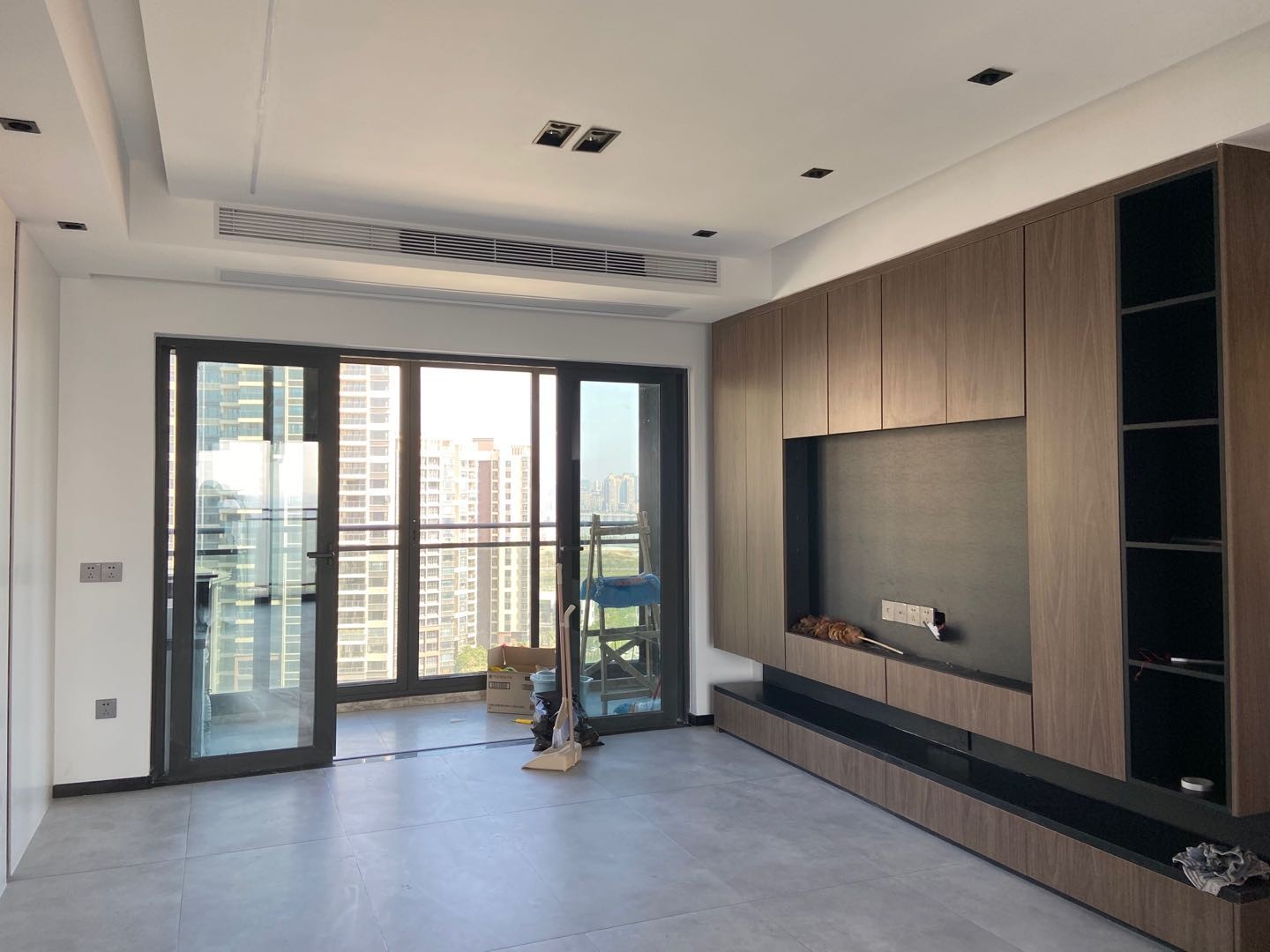 客厅电视背景墙去除传统的装饰类石材为背景,改为以储物柜形式的,电视剧暗藏进柜子里,既增加了储物功能又美观。