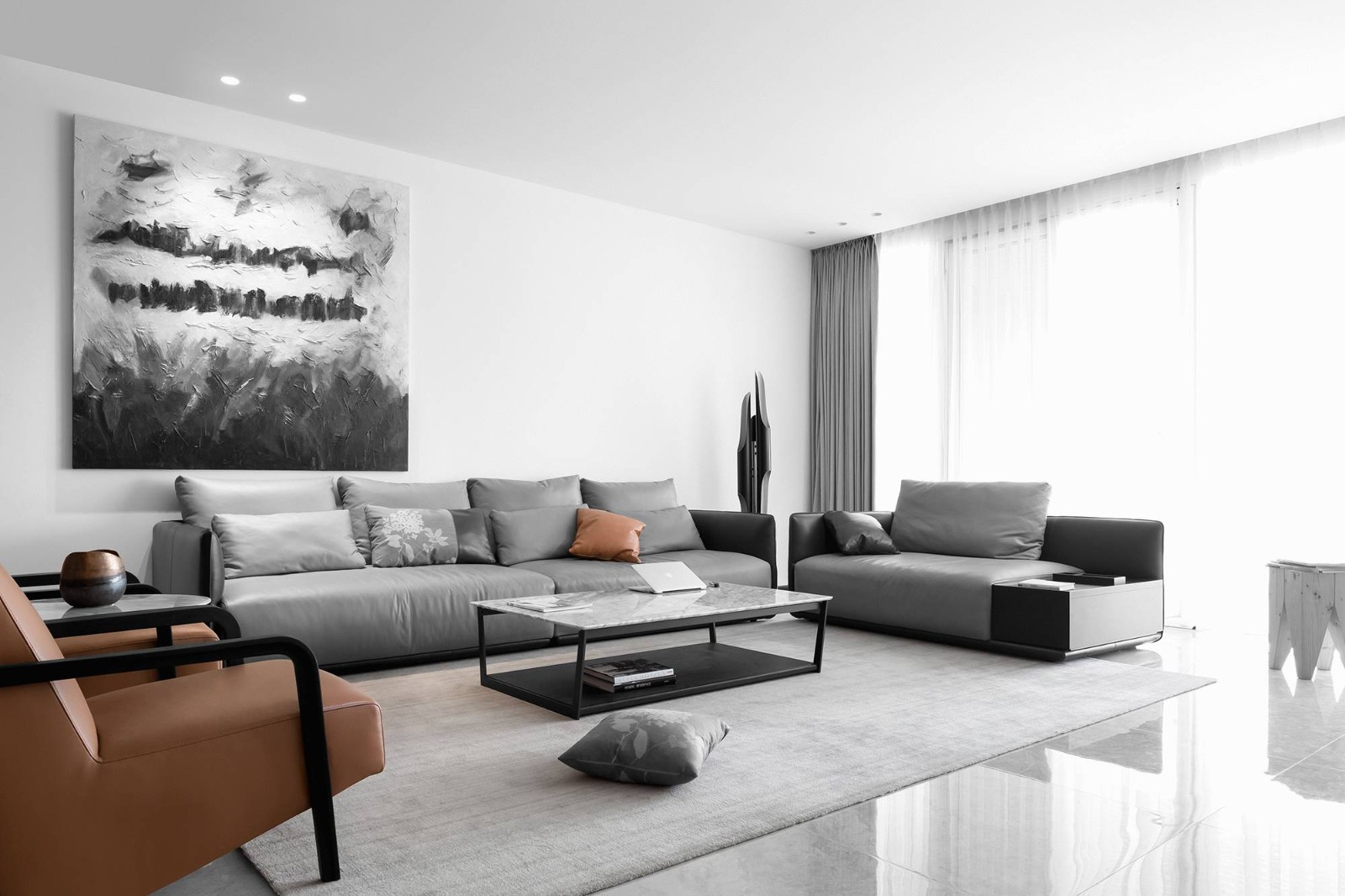 黑白色调的家更显质感,用黄色的皮椅修饰,增加空间的层次感。