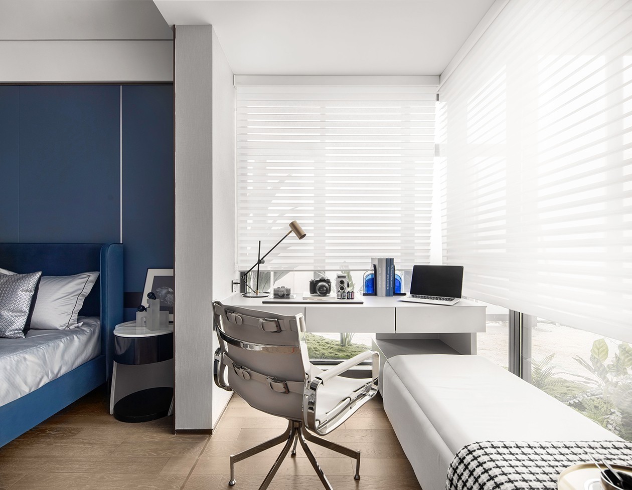 克莱因蓝玻璃茶几线条凌厉、极具艺术感,无疑成为客厅的点睛之笔