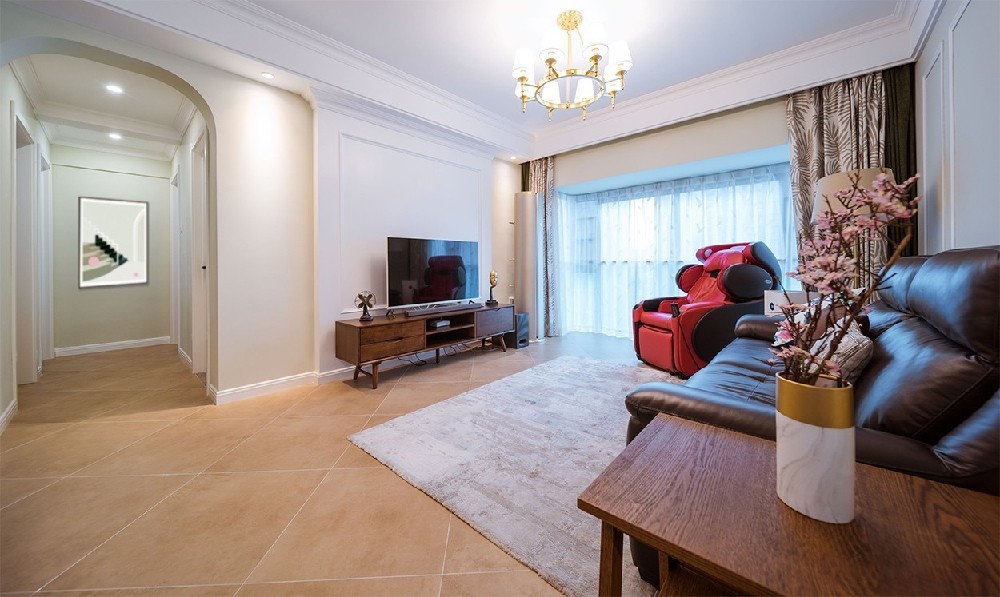 转角来到客厅,被按摩椅虏获芳心,它让下班后的慵懒一躺,瞬间活力满满。鉴定完毕,这个角儿很抢戏。 客厅地面的留白日后将是小宝宝的地盘,超级期待它被爬爬垫还有火火兔等各种育婴神器占领的样子~