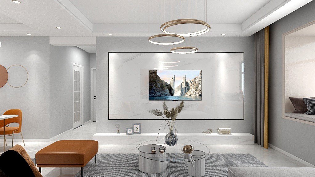 沙发背景也无需过多造型,选择装饰画颜色也是要按整体家居风格来选,爱马仕橙作为点缀。