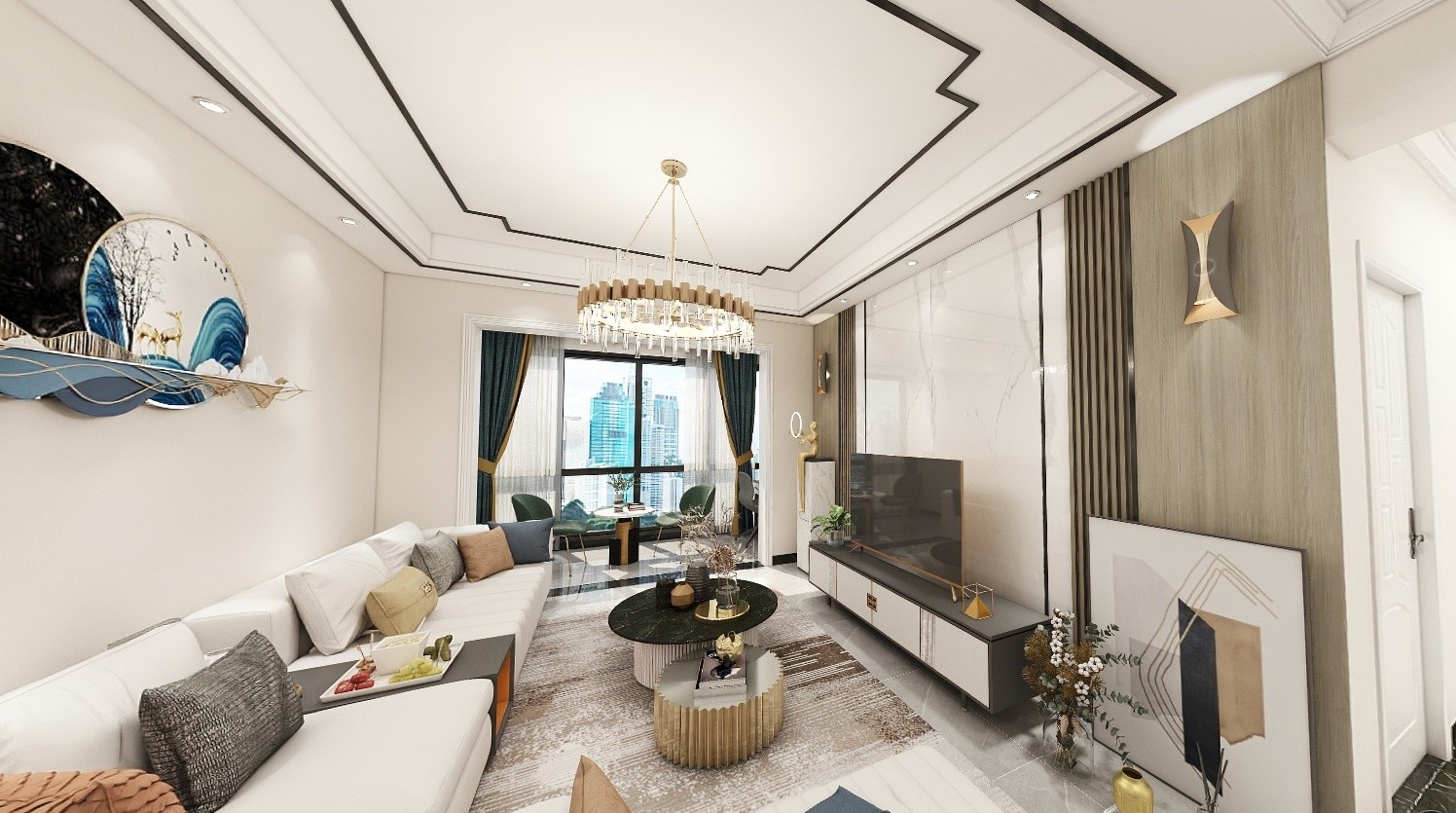 客厅地板灰色,墙壁象牙白色,家具黑灰色,黑白灰 的空间组合永远不会过时。而且也不会繁复,使人感 到现代感,时尚感。