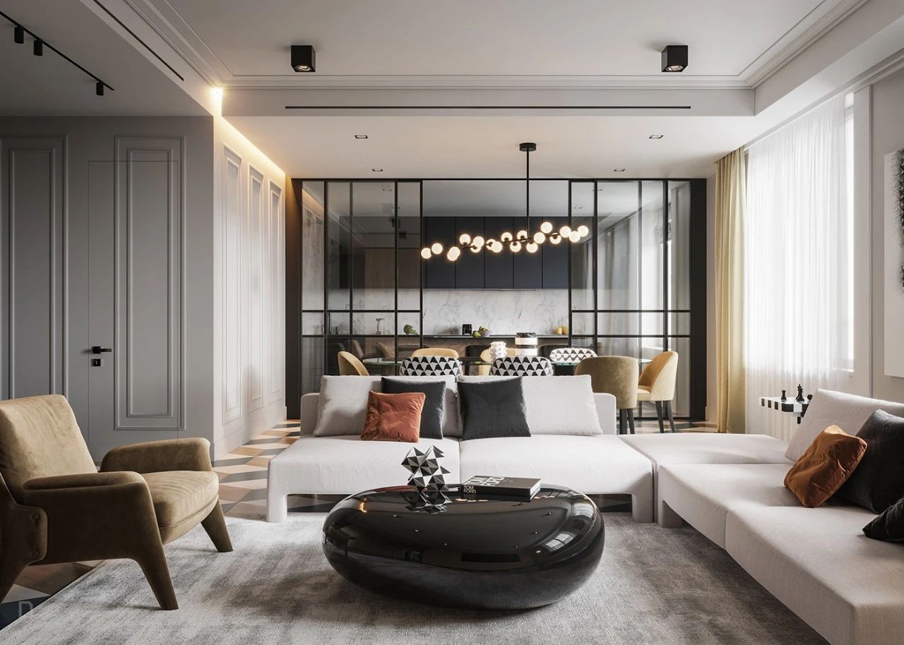 几何的元素被多次呈现于空间呼应强调现代时尚触感,如茶几上的装饰、餐厅上几张黑白餐椅,沙发边的棋盘桌。