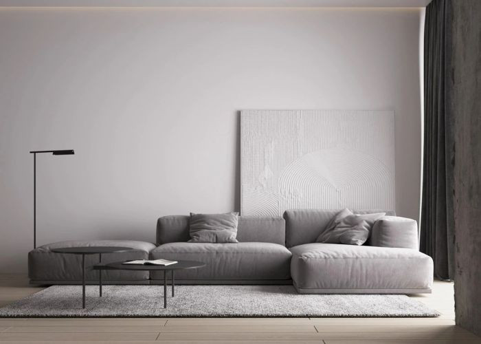 黑色电视墙与浅色沙发区形成对比 左端拼接格栅装饰面板打破沉闷 旁边大圆球地灯令整个空间更显活力