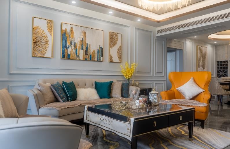 这是一套美式轻奢风格的装修案例,设计师将现代风格的时尚干练与光洁质感,融入简约美式的典雅柔美与温馨氛围。