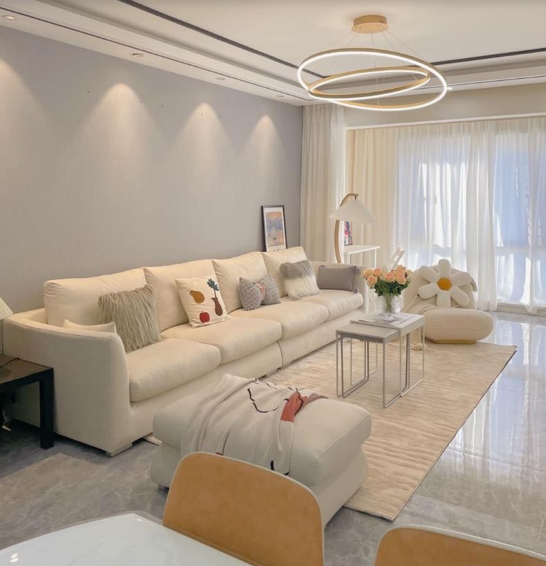 沙发背景就刷了一个太空漫步灰色乳胶漆,筒灯照下来产生的光晕也是很美的,不一定需要很复杂的造型,后期灯光也可以营造层次感~