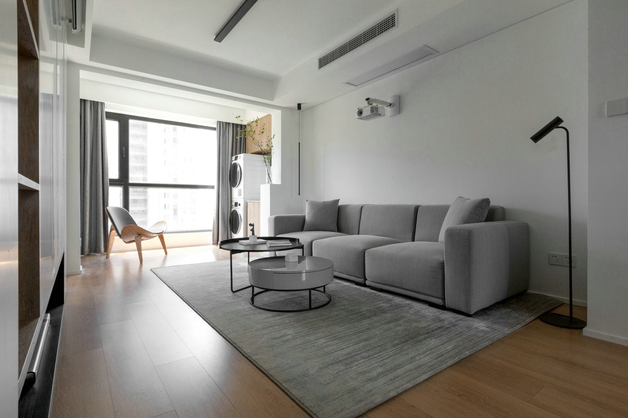 进门右边是客厅,经典的灰白搭配,再加黑色的铁艺搭配