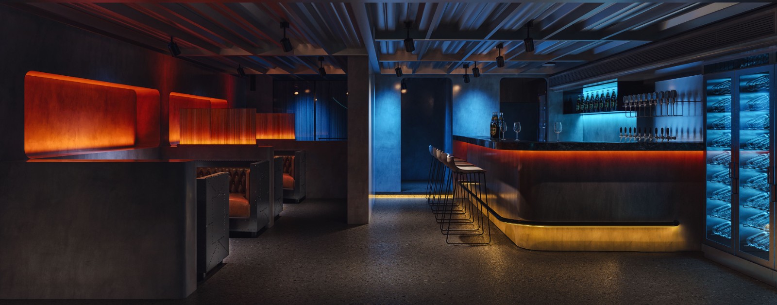 深灰色素水泥搭配深色水磨石,用多彩线条灯,营造浓厚的氛围感,具备后现代主义的朋克风。