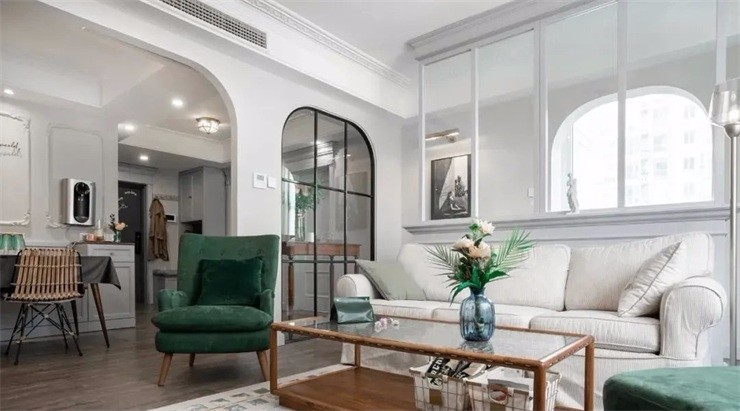 阳台的拱形垭口与客厅隔断进行呼应营造出游廊感复古的墨绿色在这优雅的氛围中起到很好的点缀作用。