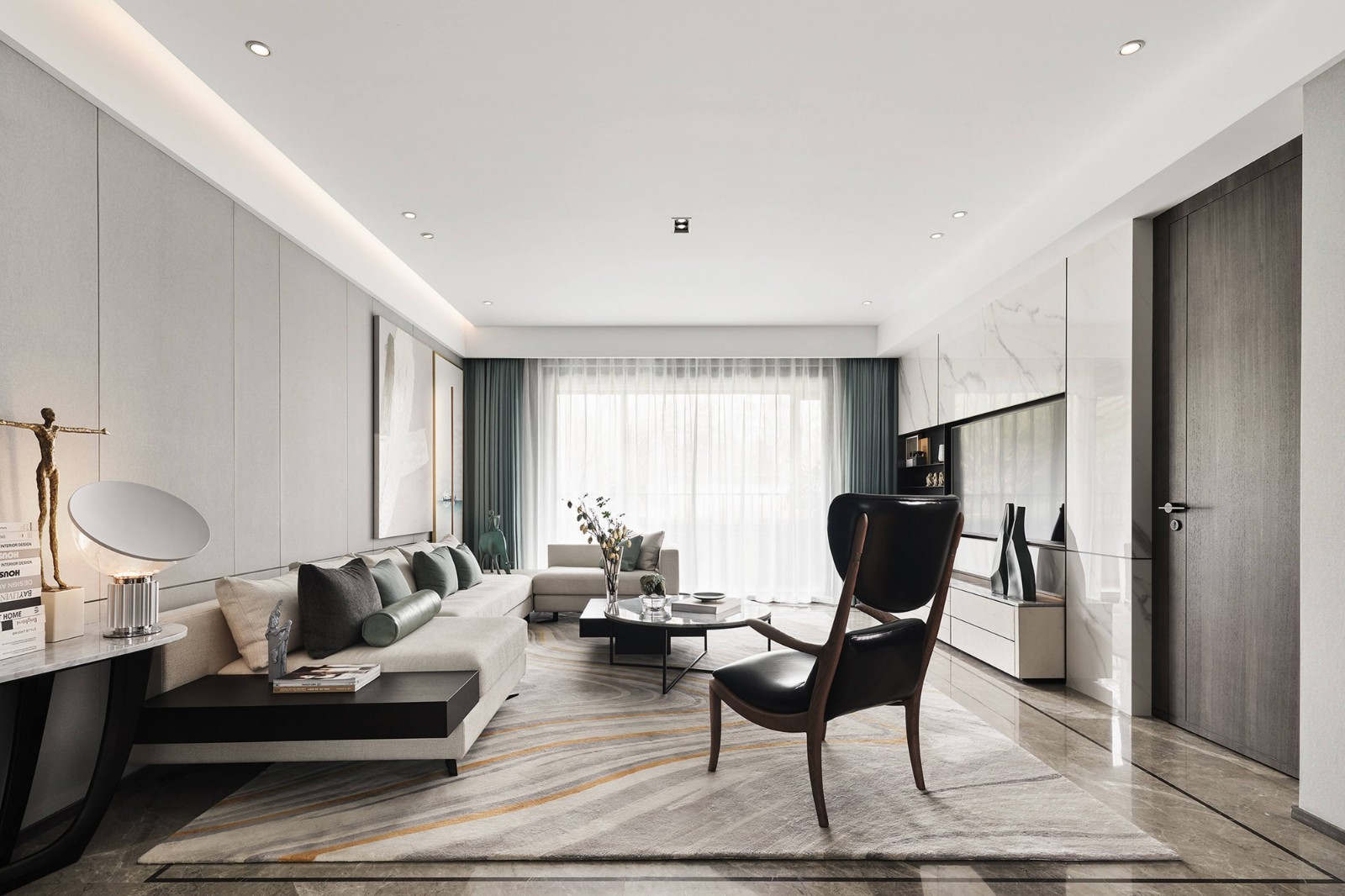客餐厅空间在整体极简和雅的气质中,不同层次的青、白、灰色和谐相融;软包、瓷板、皮料等现代风格材质,构塑空间高雅大气的当代调性。错落有序地展呈在各处的艺术品,选自沈勤、秦修平等新派艺术家,将无数主张与思想,容纳在平静的美学中,丰富空间的精神人文内涵。