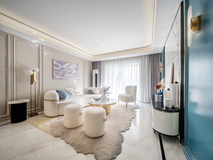 以简欧风格设计为主,与时尚元素相结合,整体空间以蓝色作为色彩基调,使用灰、白色中和,浪漫的经典蓝、布艺沙发与挂画、灯具相搭配,让空间充满故事性,营造了精致细腻而又自由浪漫的空间格调。