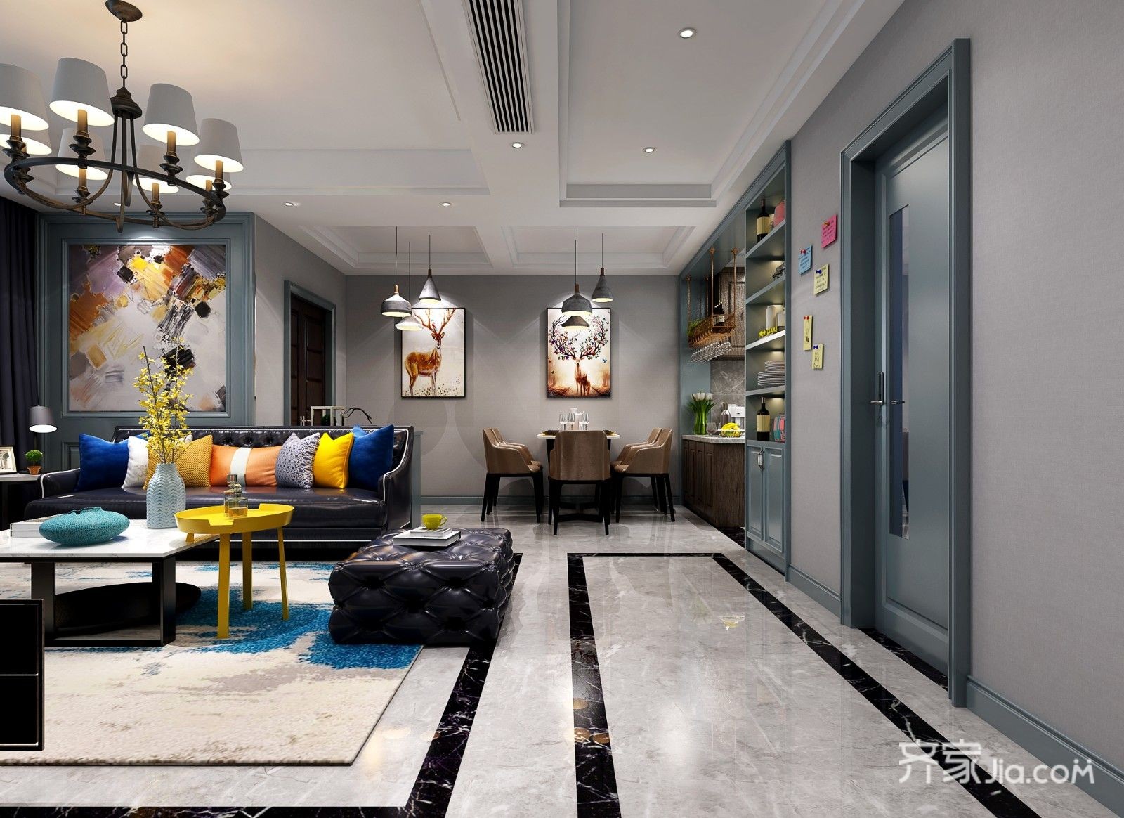 业主为80后时尚人士,希望居家感觉简单但是不沉闷,可塑性强。设计师根据业主要求地面采用仿云多拉灰大理石地砖,用仿银白龙大理石地砖做波导线,墙面用明度很低的灰蓝做主点缀色,整体格调统一。
