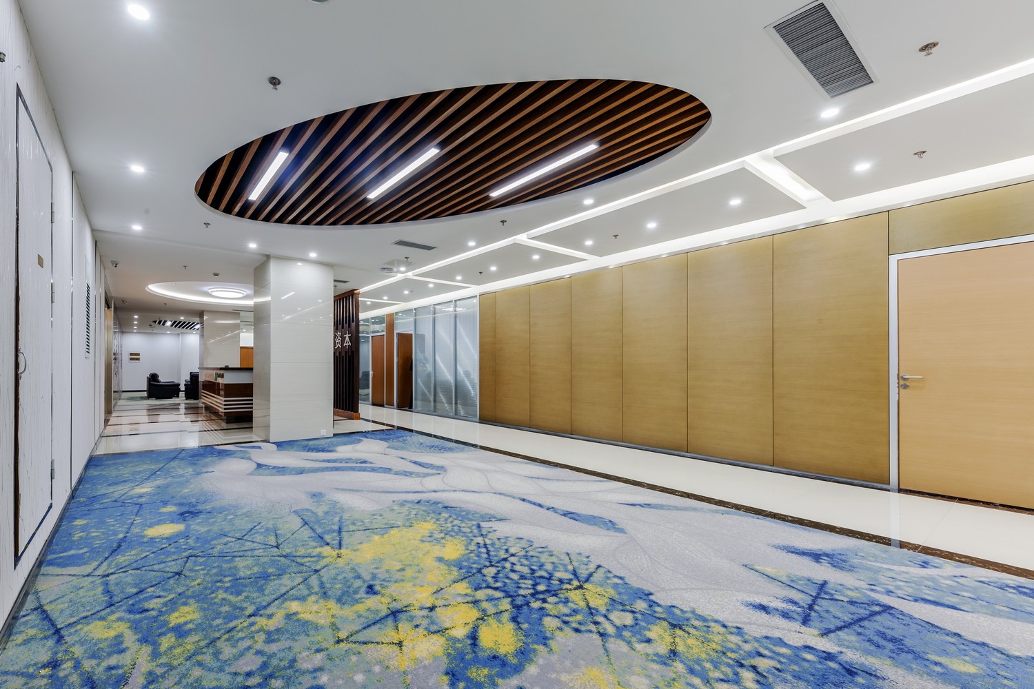 管理层办公区公共区域,椭圆方通吊顶,地面现代风格定制卷毯。
