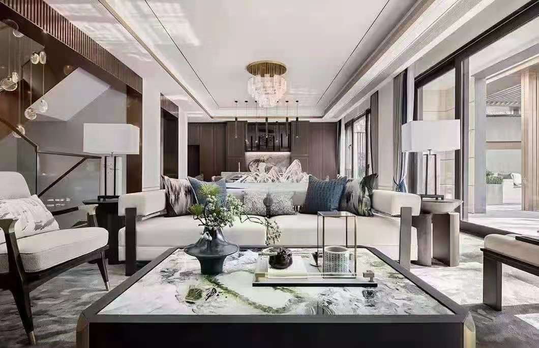 本案例为480平新中式别墅设计,进入客厅,整个空间宽敞明亮,整面超大的落地窗将室内与庭院联通,光线洒入室内,让整个空间仿佛朦上一层柔美的滤镜。