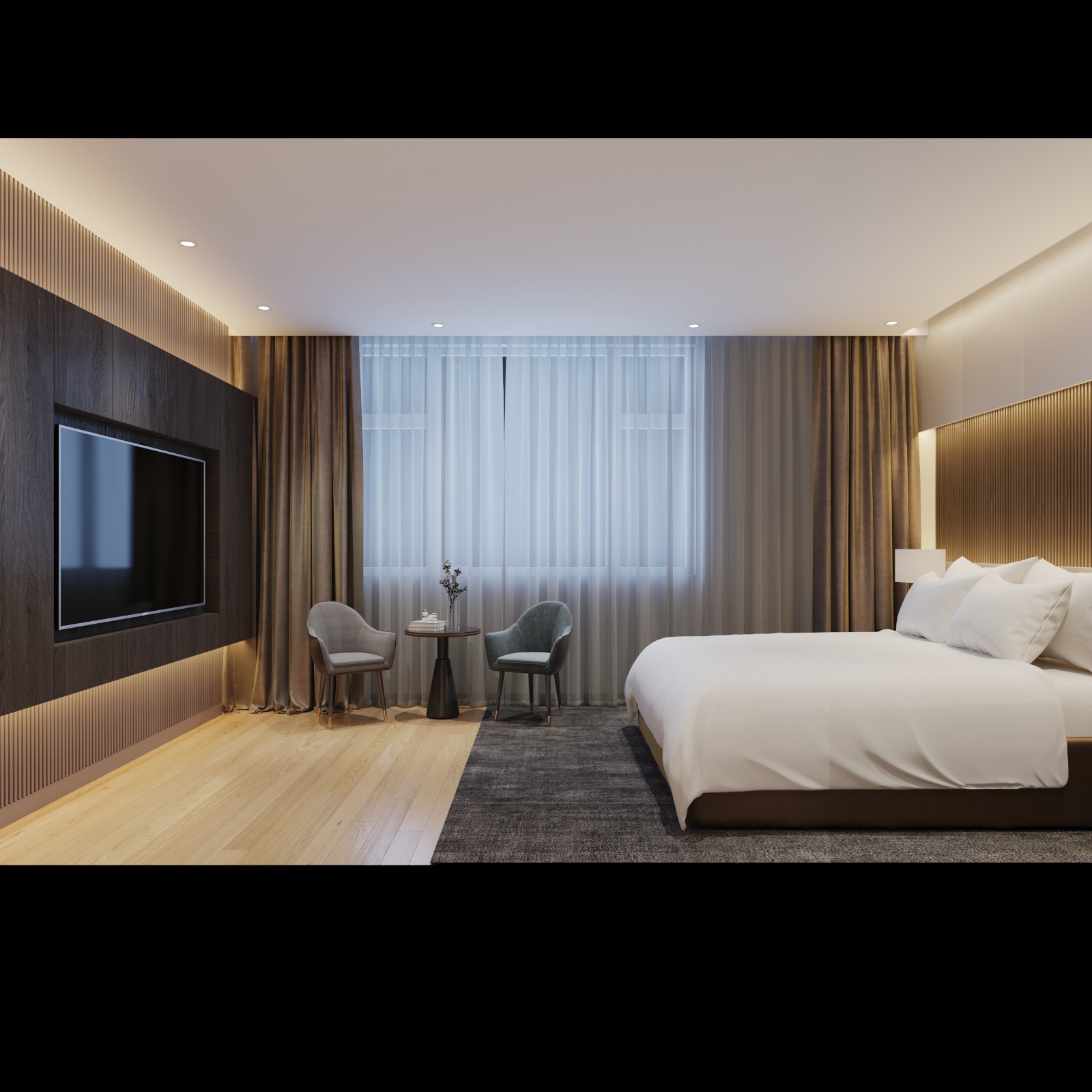 格栅+板材+LED隐形灯搭配电视背景墙和床头造型。德尔实木复合地板。