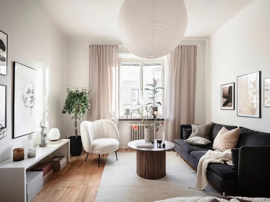 深色的三人沙发+羊羔绒单人沙发+圆形木制茶几