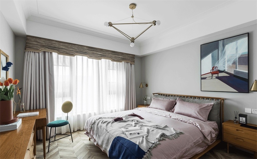 饱满而柔软的床头床品,加上两侧金属壁灯,让原本面无表情的空间无比温馨
