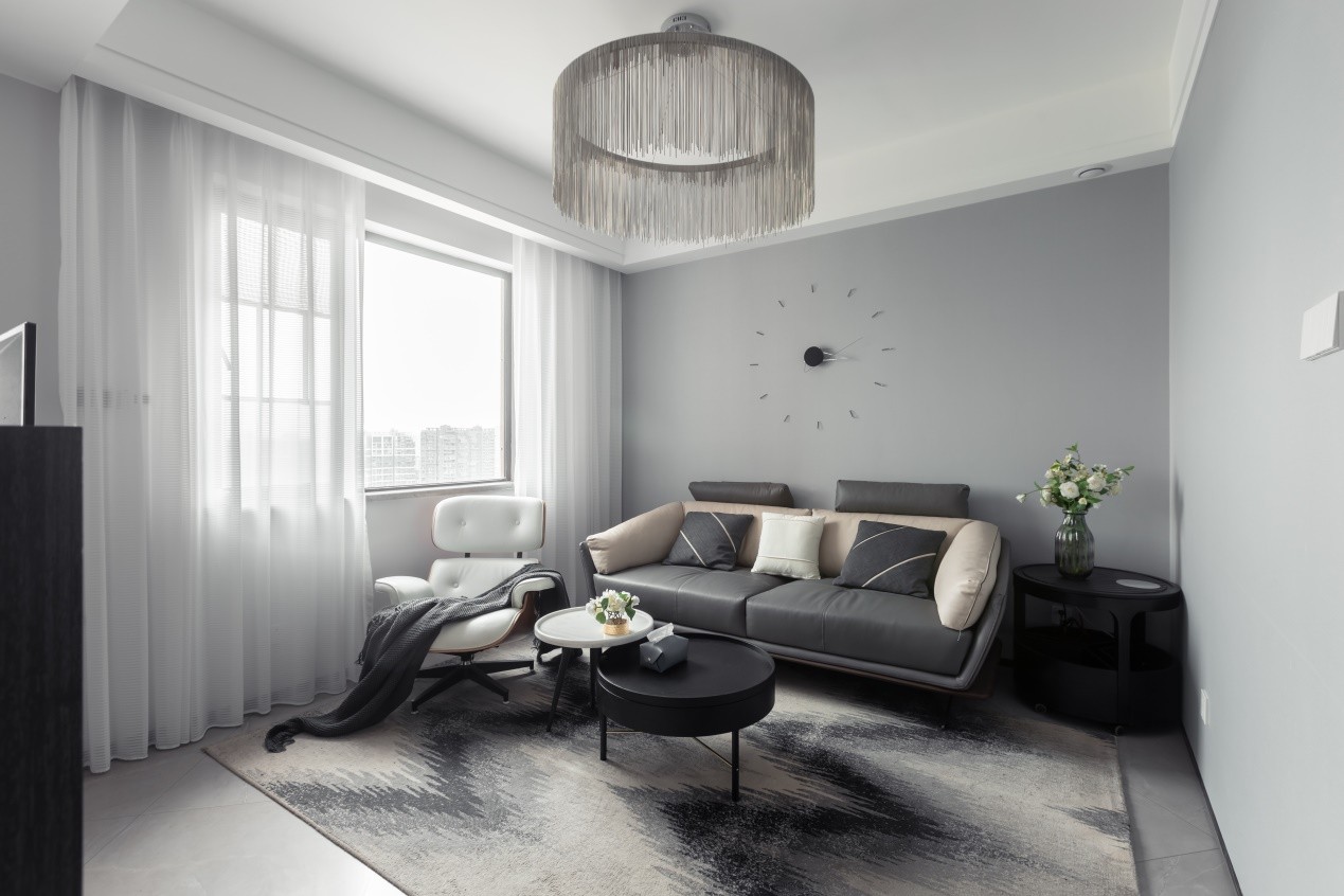 客厅以圣洁的白色纱帘与灰色墙体搭配奠定主基调,回形吊顶勾勒出整体空间线条,搭配皮质沙发,灰与白之间你中有我,静可以窝坐于柔软沙发之上享受宁静时候,立可远眺窗外风景,甚是惬意。