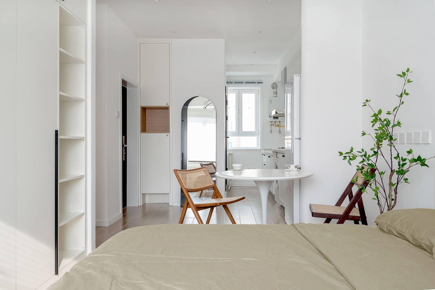 餐桌与厨房的交接处,墙体做了倒弧处理,避免直角磕碰。地面是木纹砖通铺,贯穿这个房和厅,让空间更有延伸感。