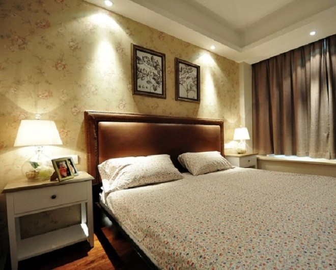 墙面采用了木质地板材,使卧室更温馨有家的感觉