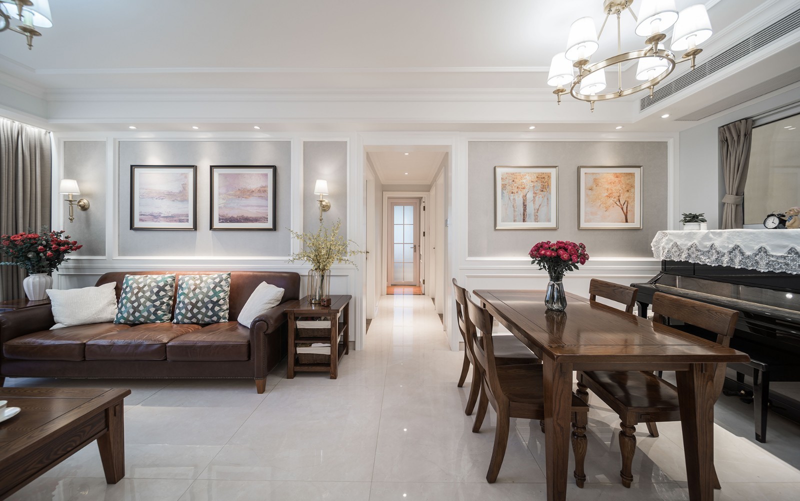 客厅墙面保留着美式风格的造型美态,以灰衬托褐色皮质沙发。