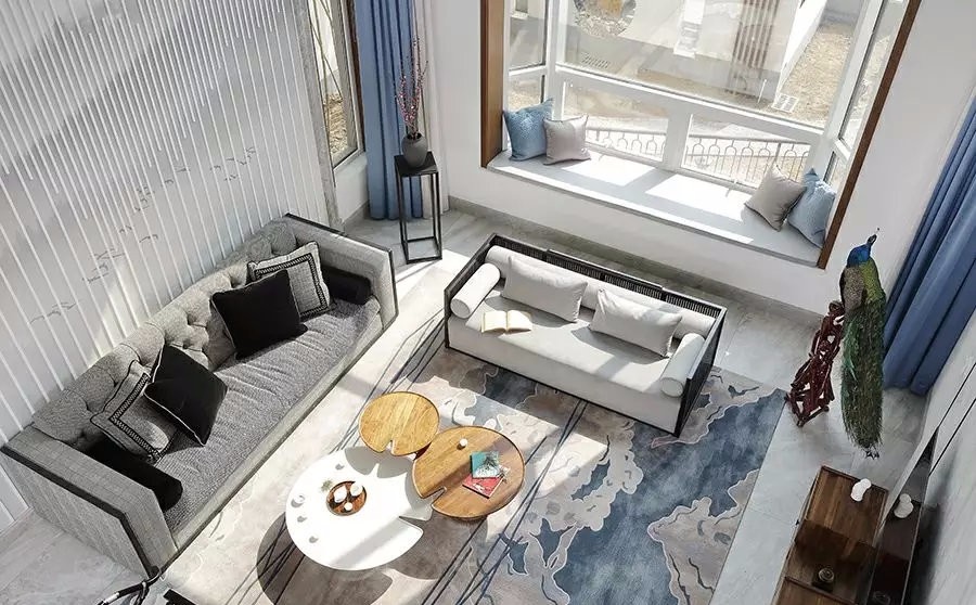 新中式风格下的挑空客厅,空间通透,更有待客的仪式感,大面积的窗户,广纳自然光线,光与影相携而至,复古与现代,山与海形意相连。