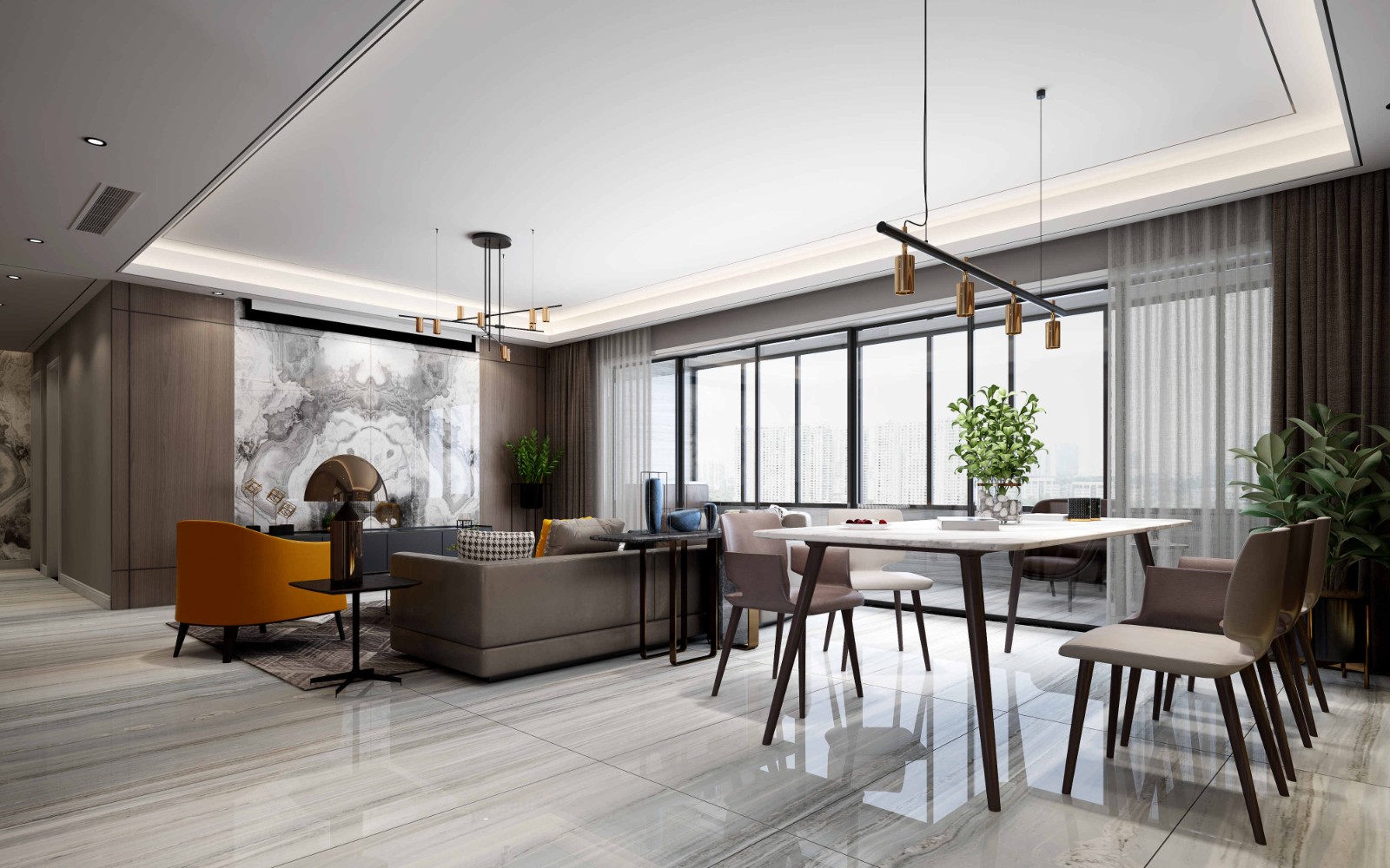 客厅的背景用了木饰面和大理石两种材质,为了体现点线面关系,加入了不同比例的分割线,而开放式书房的书柜,也用了木饰面和大理石。