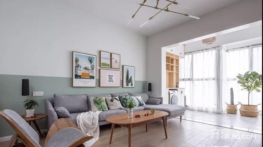 客厅清新舒爽又安逸极了,沙发背景墙一半白,一半墨绿,搭配自然风情装饰画,给人大自然的清新明媚