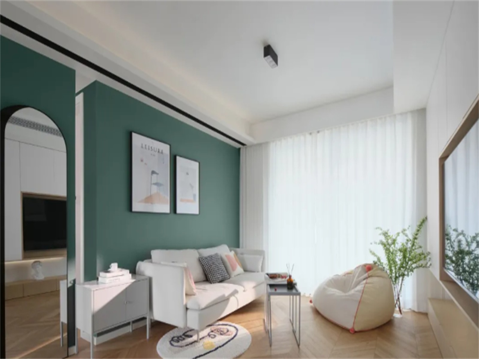 客厅,鱼骨拼木地板搭配奶白色双人布艺沙发和简单的铁艺茶几,清新绿打造自然惬意的氧气之家