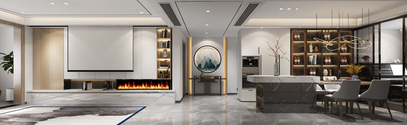 境,取自“巧”与“简”之间。步入厅门,长廊闲情通幽,线性肌理下,是远山淡影、浓郁有致的美感。