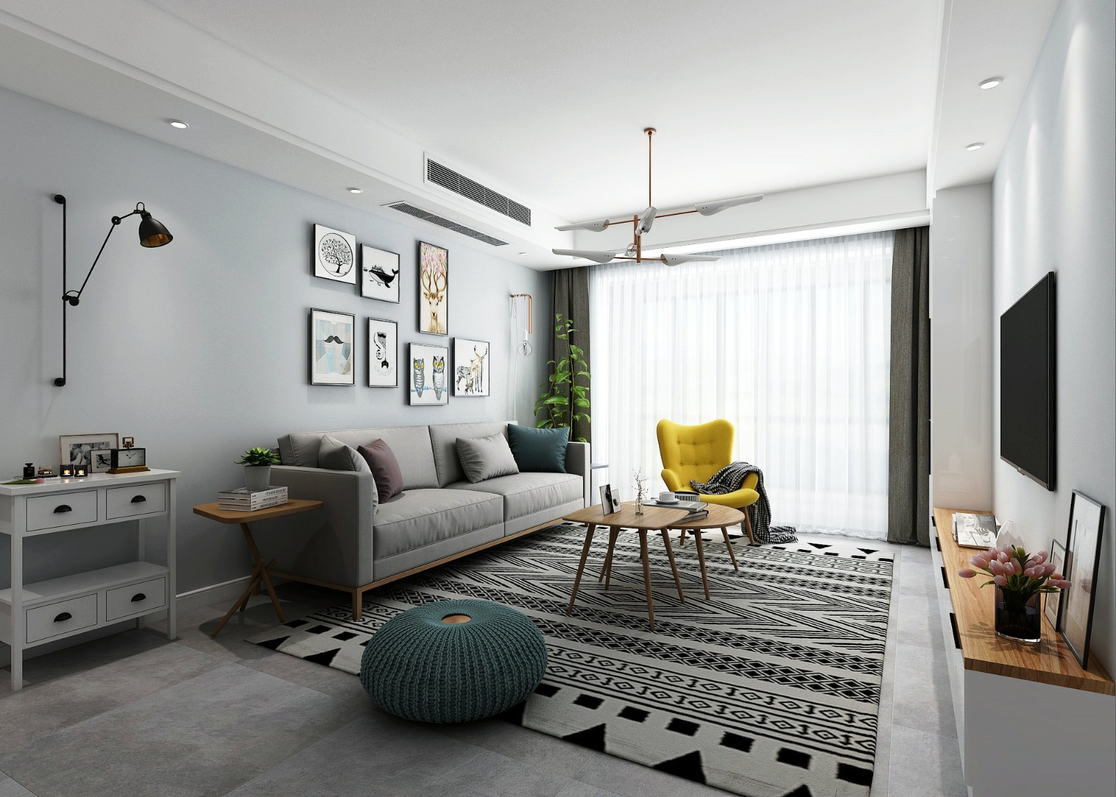 简单的空间,搭配黑白配的挂画,地毯处加入素雅的色彩,使得空间充满简洁舒适的艺术气息。
