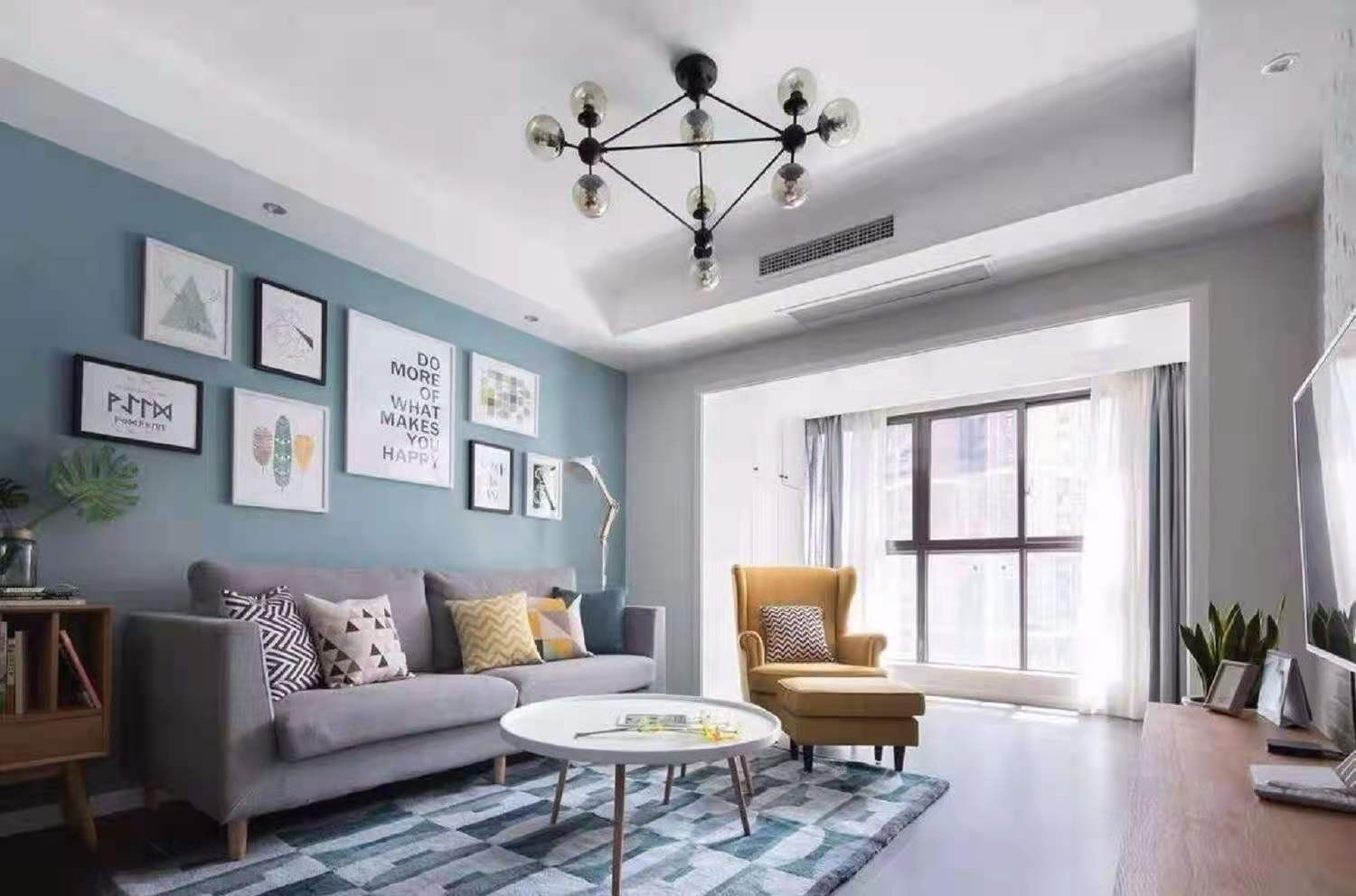 沙发墙配以低调奢华的蓝色,灰色布艺沙发。