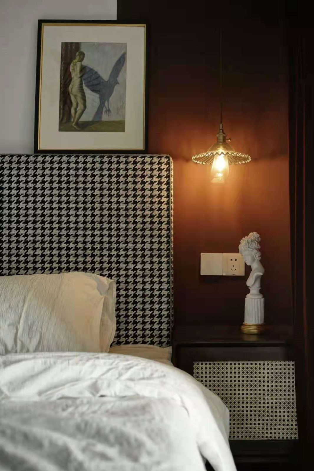 在黄铜吊灯的映衬下,红色墙漆更显氛围感