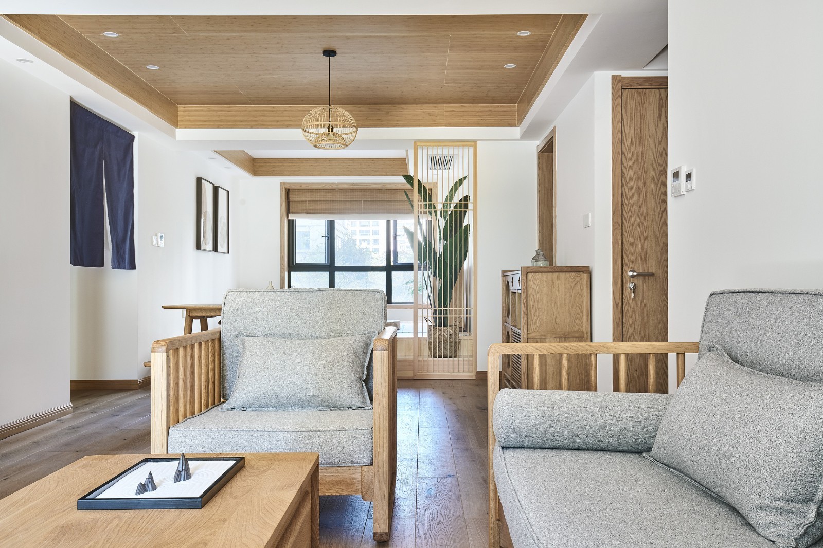 整个空间色调统一, 白色与原木色的搭配简单干净, 吊顶很好地平衡了颜色比例, 很佛很平静。 没有过多的装饰, 节制却精致
