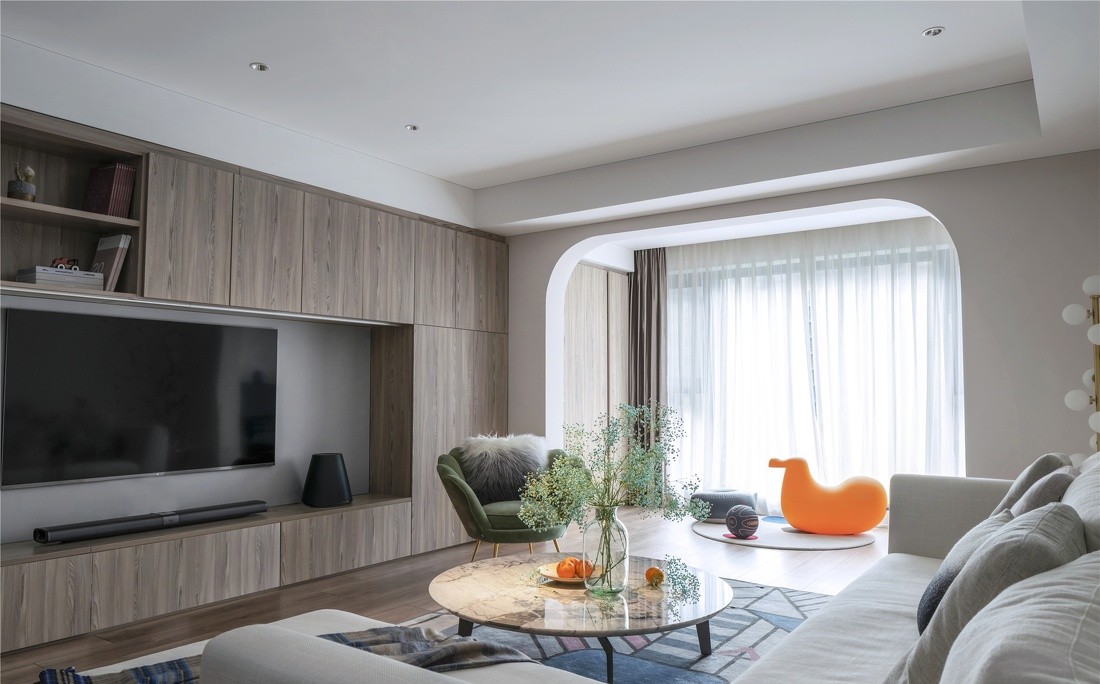 客厅内围绕着电视机的联排柜子尺寸各异,满足储物功能的同时,亦可摆设小物件穿插其间,以此点缀空间。也与悬挂在客厅墙面由不同色块组成的时钟相呼应,简单大方、充满童趣。