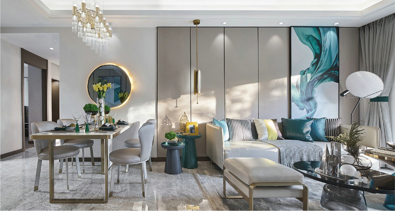 餐厅和客厅相连,浅蓝色的元素加入让空间在视觉上层次更丰富。
