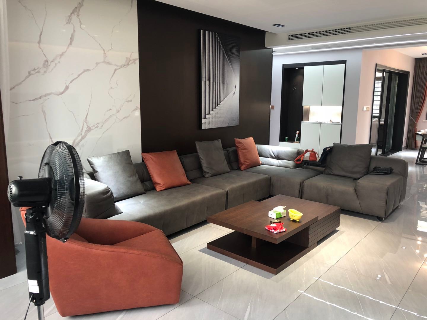 沙发背景采用岩板于木饰面相结合以彰显出客厅的磅礴大气