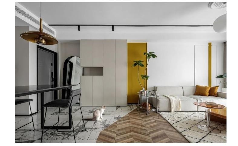 空间大面积留白,黑色线条从入户贯通到客厅,乍看像是筒灯轨道,实则乳胶漆的分色处理,在视觉上制造无秩序的反差美。