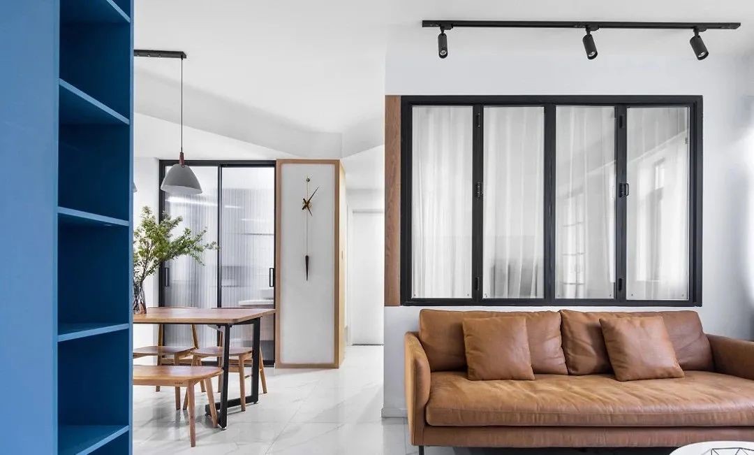 蓝色柜体的点缀形成视觉上的跳跃感,让客厅更加清爽、沉静。