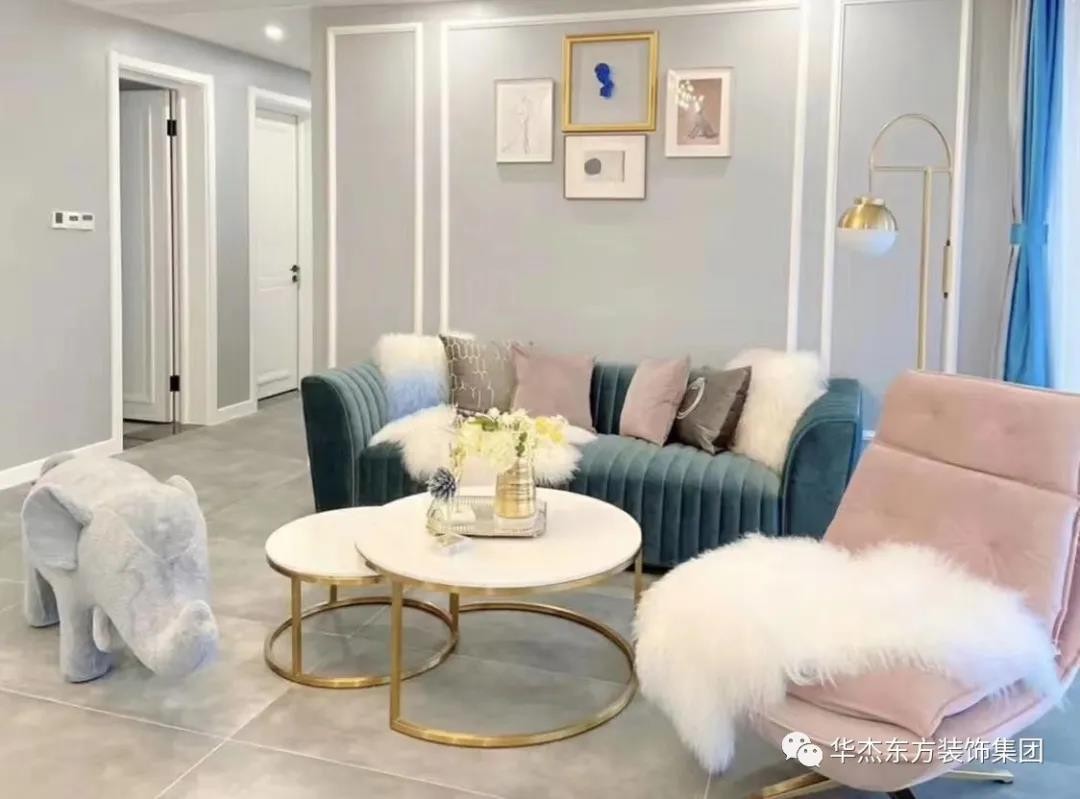 空间背景墙涂刷淡蓝色乳胶漆,加入白色石膏线进行调剂,挂上几幅极简格调的装饰画,令空间更显文艺时尚。 客厅的色彩搭配让人很放松,墨绿与粉色的绒面沙发,结合金属色钓鱼落地灯与错落的圆形茶几,让空间显得舒适而精致。