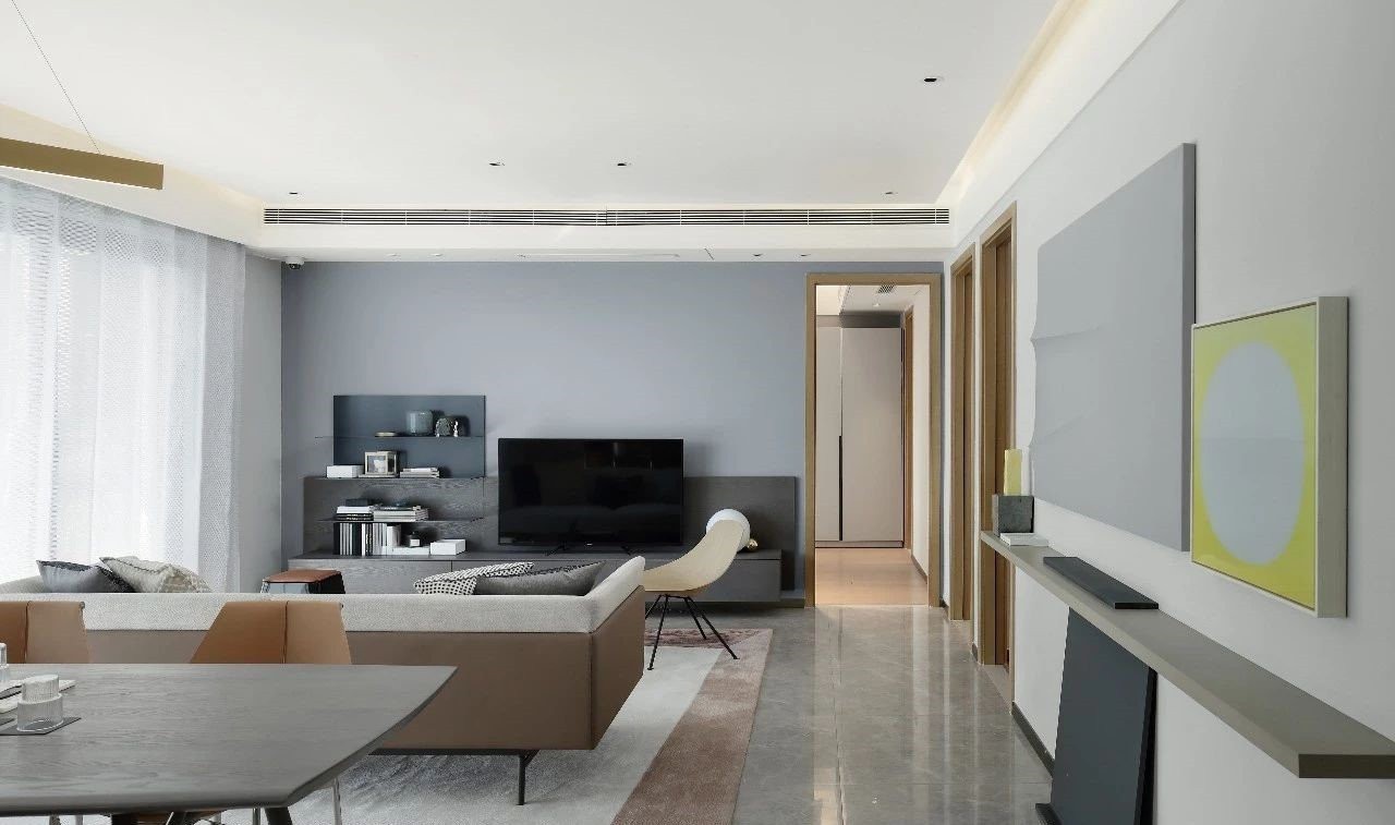 灰白空间的客厅,以粗犷自然的沙发墙,搭配现代优雅的电视背景墙。营造出一种独特高档的现代大气感。