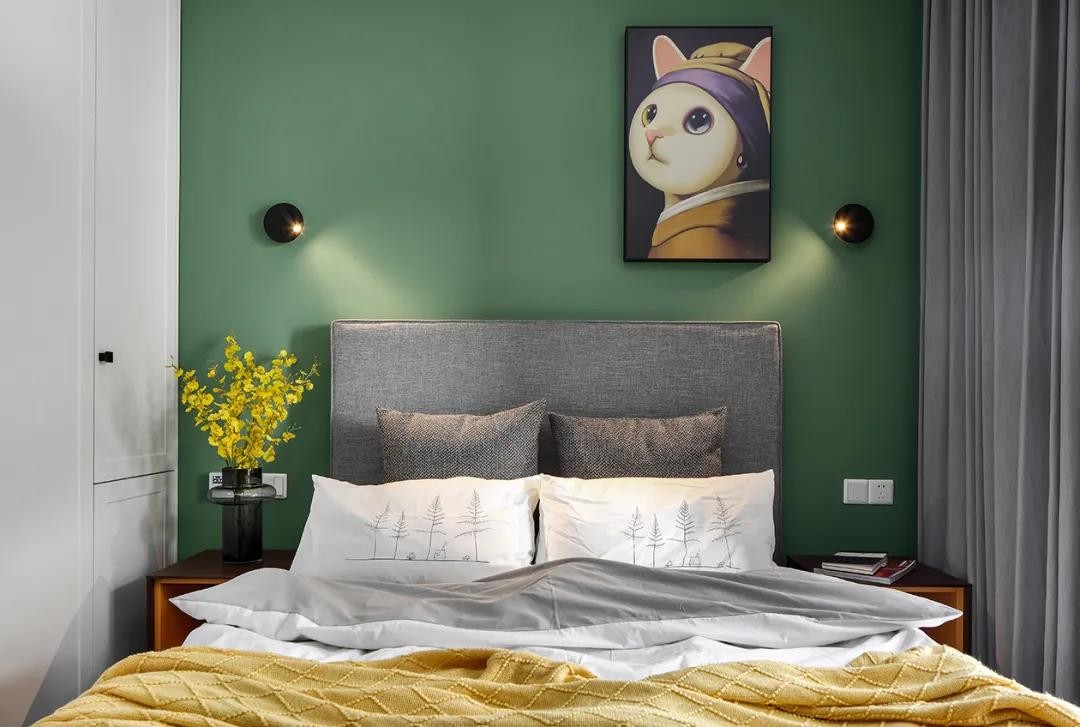 卧室床头墙以墨绿色的背景墙基础,挂一幅猫头装饰画,略显可爱俏皮,两侧装上简约的黑色小壁灯,中间布置灰色布艺床铺,左右两侧布置床头柜,床头柜上的跳舞兰与黄色床单相呼应,增添了空间的温馨与活力感。