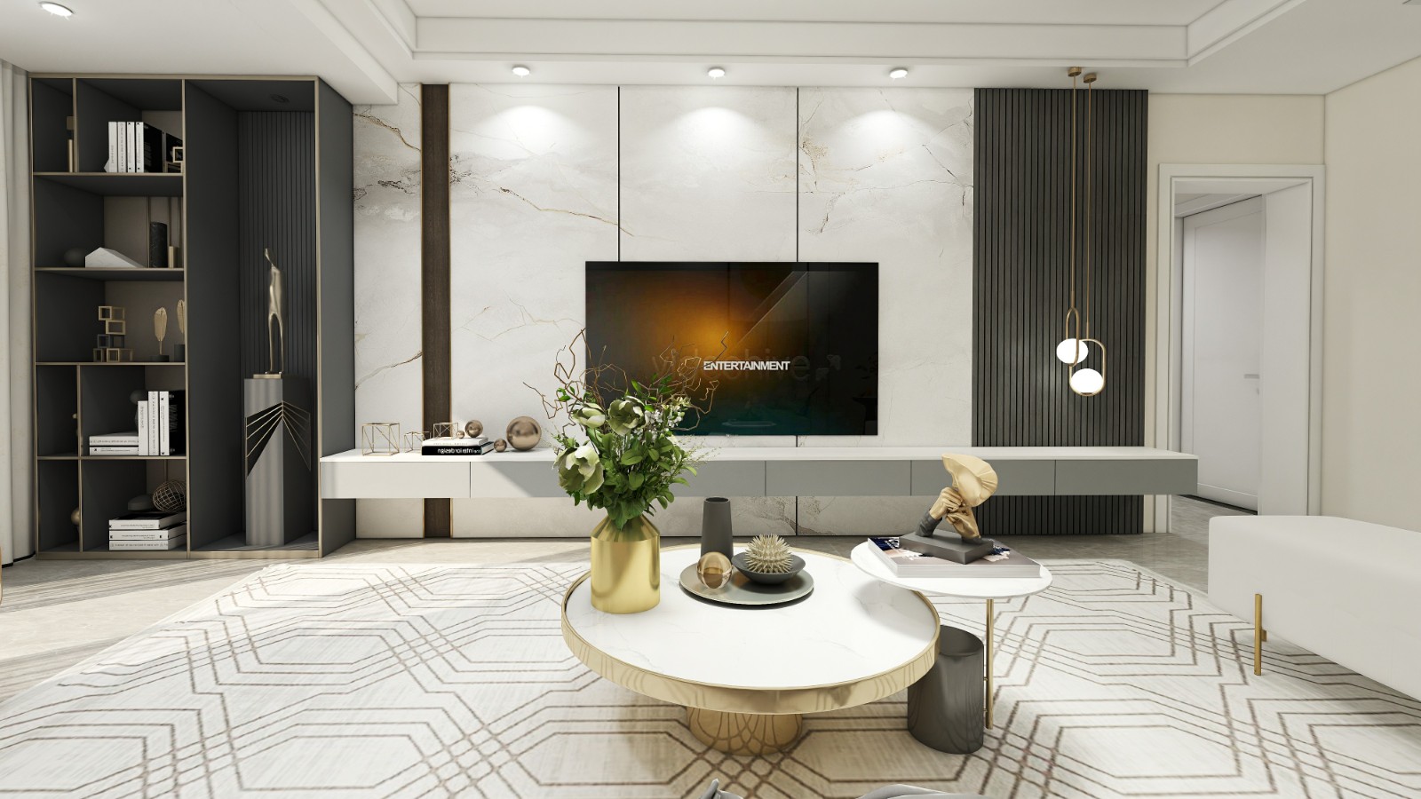 无顶灯设计,线条感纵向拉伸客厅,岩板和木饰面的结合,中合冷硬的线条。增加温暖的气息。