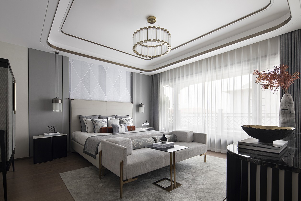 主卧选用了意大利国宝级品牌的Giorgetti的床,沉稳的木色与温暖的皮革别具一格,安放柔软。