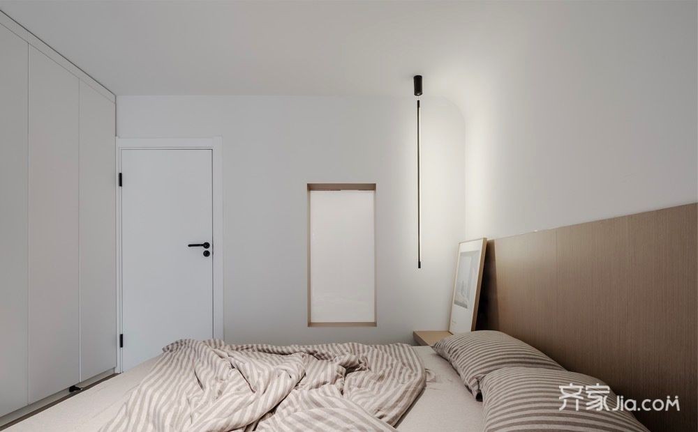 二楼的另一个区域,是综合活动室,定制的书桌保障了基础使用功能。 地台设计可以储物,也可以当作临时客卧。 朋友来访时,可以一起喝茶聊天,平日里可以当作健身角。夜晚拉上窗帘,书房又化身为家庭影院,把这个多功能角落发挥得淋漓尽致。家人或朋友来留宿时,把过道中间的隐形门拉开,就轻松变成了小两室。 平时收折起来,不占用空间,还能保障通风采光。