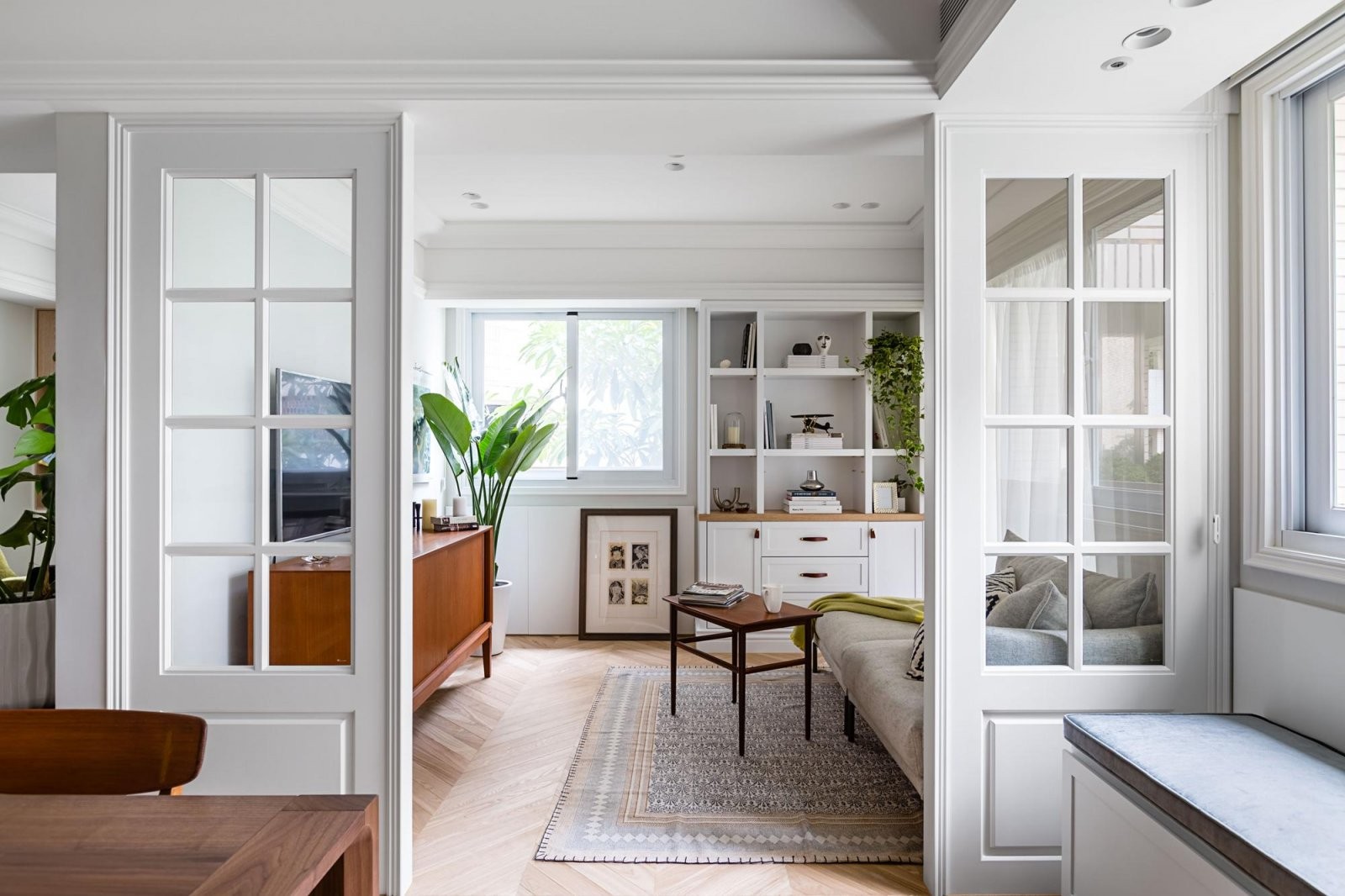 白色隔断搭配原木色地板。