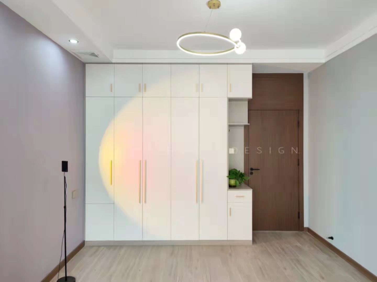 本户型属于三室两厅一厨两卫两阳台,客厅阳台相对于正常户型将近大一倍,虽然不是正常的南北通透户型,但是采光足够。本设计方案风格属于极简轻奢,我们的业主由于对生活有品质上的追求,整体没有过多的装饰,原木色为辅助色,金色为点缀,线条感虚实结合,满满质感细节。