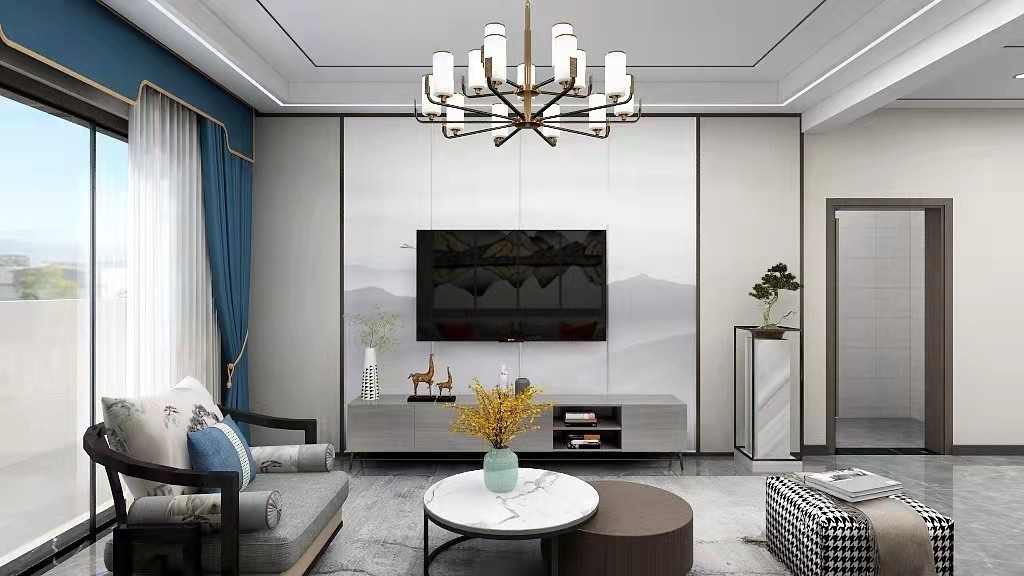 电视墙:新中式讲究对称美材质为竹木纤维集成板