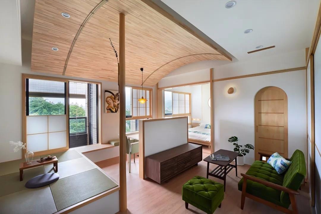 由牆上圆窗看向悬落而下的吊灯,桧木天花画出圆弧线条,视线层层递进紧密牵繫公区域,即使隔牆擘划著独立卧室,仍无阻与公空间的互动与对话,只需拉出藏身于牆内的袄门,私密睡眠场景即悠然成形。